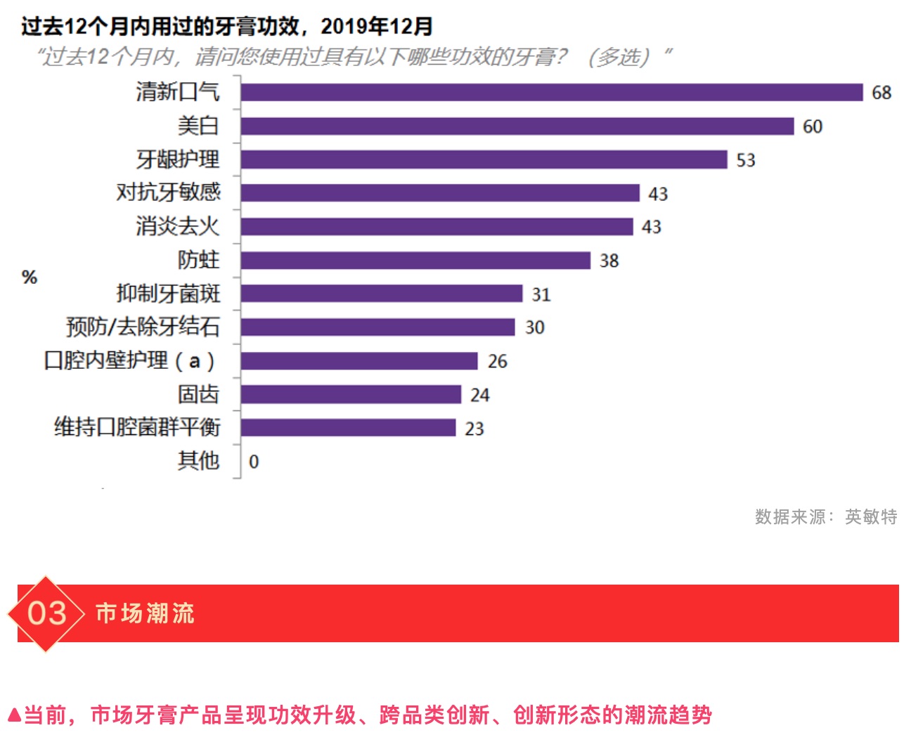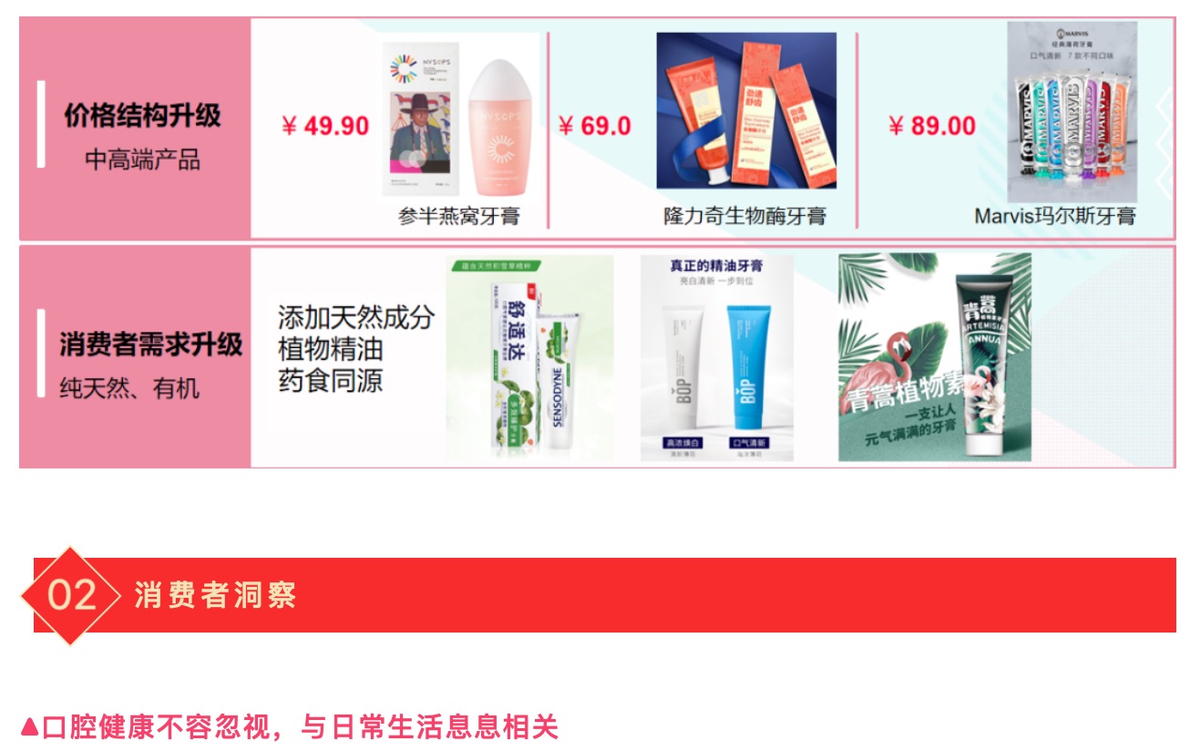 全口腔護(hù)理、即時(shí)美白、多效合一的功效升級(jí)口腔護(hù)理產(chǎn)品涌現(xiàn)市場(chǎng)。