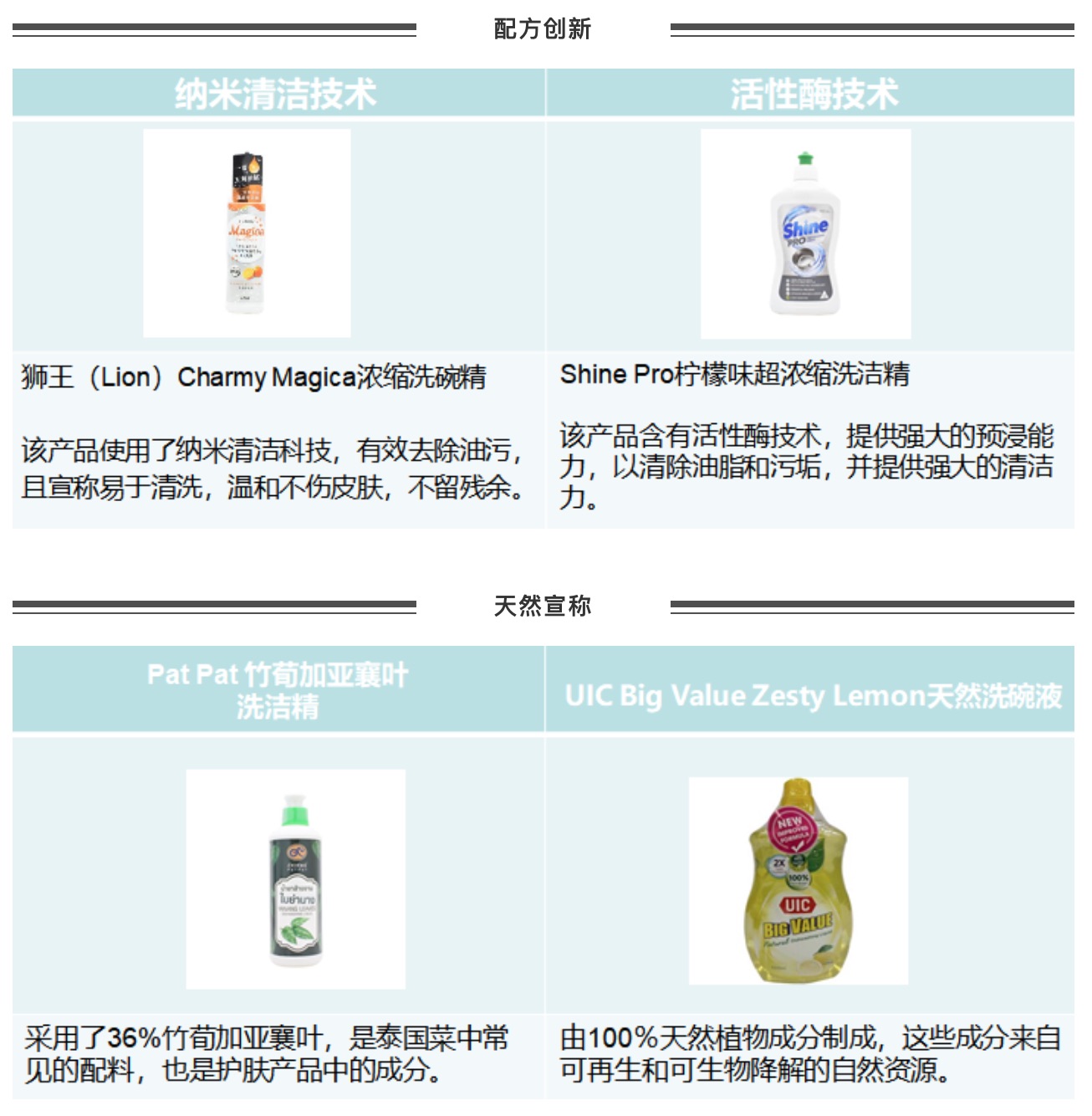 因此,在針對該需求的競爭中,環(huán)保、便于使用、植物草本成餐具清潔劑的熱門宣稱。產(chǎn)品主要圍繞著綠色安全、高效便捷為主。